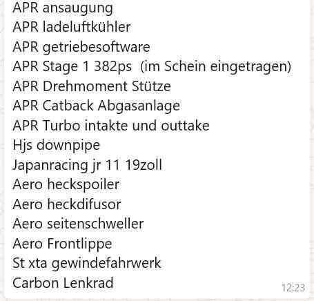 3-Punkt-Sicherheitsgurt hinten mitte | Abbiegelicht | Ablagefach am Dachhimmel | Airbag Beifahrerseite abschaltbar | Airbag Fahrer-/Beifahrerseite | Ambiente-Beleuchtung | Anti-Blockier-System (ABS) | Antriebs-Schlupfregelung (ASR) | Antriebsart: Allradantrieb | Auspuffendrohr (4) sichtbar / verchromt | Ausstattung R | Auto-Hold-Funktion | Außenspiegel asphärisch, links | Außenspiegel elektr. verstell- und heizbar | Außenspiegel konvex, rechts | Außenspiegel mit autom. Absenkfunktion, rechts | Blinkleuchte in Außenspiegel integriert | Bremsassistent | Chrom-Paket 2 | Dachhimmel Stoff, schwarz | Dachspoiler | Diebstahl-Warnanlage mit Innenraumüberwachung | Doppeltonhorn | Durchladeeinrichtung (Mittelarmlehne hinten) | Einparkhilfe vorn und hinten | Einstiegshilfe Easy-Entry | Einstiegsleisten (Edelstahl) vorn, beleuchtet | Elektron. Differentialsperre (EDS) | Elektron. Differentialsperre (XDS) | Elektron. Stabilitäts-Programm (ESP) | Fahrassistenz-System: Anhänger-Stabilisierungs-Programm | Fahrassistenz-System: Müdigkeitserkennung | Fahrassistenz-System: Umfeldbeobachtungssystem (Front assist) mit City-Notbremsfunktion | Fensterheber elektrisch | Frontscheibe Verbundglas getönt | Funkschlüssel (2) klappbar | Fußmatten Textil | Fußraumbeleuchtung vorn LED | Getriebe 7-Gang - Doppelkupplungsgetriebe DSG | Handschuhfach mit Kühlfunktion | Heckleuchten LED, dunkelrot, Blinkleuchten dynamisch | Heckscheibenwischer | Innenausstattung: Dekoreinlagen Carbon Touch | Isofix-Aufnahmen für Kindersitz an Rücksitz | Karosserie: 3-türig | Kennzeichenbeleuchtung LED | Klimaanlage Climatronic 2-Zonen | Knieairbag Fahrerseite | Kopf-Airbag-System vorn und hinten inkl. Seitenairbag vorn | Kopfstützen hinten (3-fach) | Kühlergrill schwarz mit Chromleiste unten | Lendenwirbelstütze Sitz vorn links | Lendenwirbelstütze Sitz vorn rechts | Lenkrad (Leder) mit Multifunktion und Schaltfunktion (R-Line) | Lenksäule (Lenkrad) mechan. verstellbar, Höhen-/Längsverstellung | Leseleuchten vorn und hinten LED | Licht- und Sicht-Paket 1 | Mittelarmlehne vorn | Modellpflege | Motor 2,0 Ltr. - 228 kW 16V T FSI | Multifunktionsanzeige Premium (Farbdisplay) | Nebelschlussleuchte | Nichtraucher-Paket | Parkbremse elektrisch | Pedale Edelstahl | Progressivlenkung | Reifen-Reparaturkit (Tire Mobility Set) | Reifenkontroll-Anzeige | Rücksitzlehne geteilt | Schadstoffarm nach Abgasnorm Euro 6 | Schalt-/Wählhebelgriff Leder | Scheinwerfer LED mit dynamischem Kurvenlicht | Schublade / Ablagefach unter Sitz vorn links | Schublade / Ablagefach unter Sitz vorn rechts | Sicherheitsgurte vorn mit Gurtstraffer, höhenverstellbar | Sitz vorn links höhenverstellbar | Sitz vorn rechts höhenverstellbar | Sitze: Top-Sportsitze vorn | Sonnenblenden mit Spiegel (beleuchtet) | Stabilisator vorn | Start/Stop-Anlage | Steckdose 12V im Koffer-/Laderaum | Stoßfänger R | Tagfahrlicht LED | Türgriffe außen Wagenfarbe | Warnanlage für Sicherheitsgurte vorn | Wegfahrsperre (elektronisch) | Winter-Paket | Zentralverriegelung mit Fernbedienung |